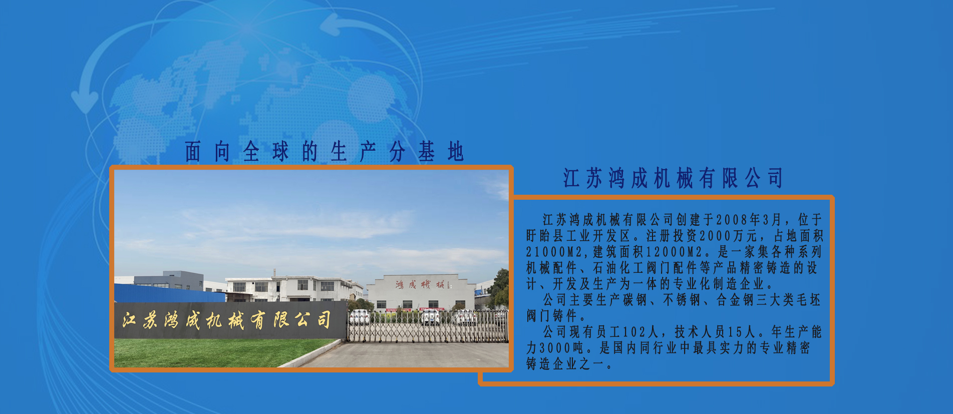 鄞州鸿成机械有限公司通过全体员工的团结奋进、顽强拼搏,发展迅速,公司占地面积7200平方米,已有员工180余人,拥有各类专业技术人员。专业生产各类普碳钢、合金钢、不锈钢、精密铸造产品广泛用于冶金、矿山、石油、化工、铁路、船舶、车辆等机械制造行业年产精铸件2500吨以上。